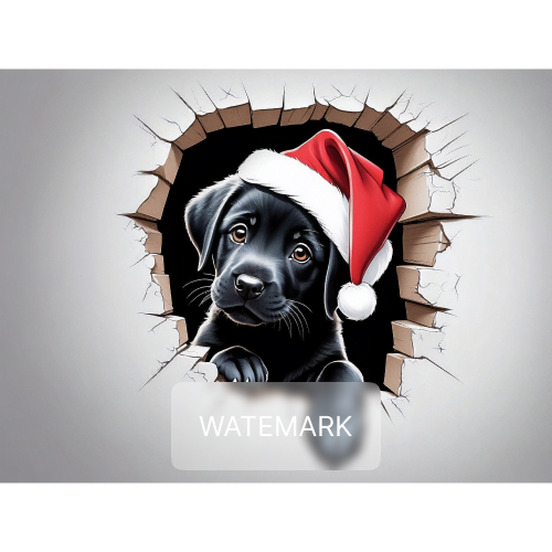 A playful black puppy with soulful eyes peers through a torn paper, sporting a festive Santa hat.